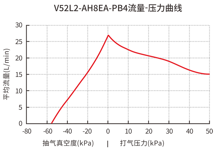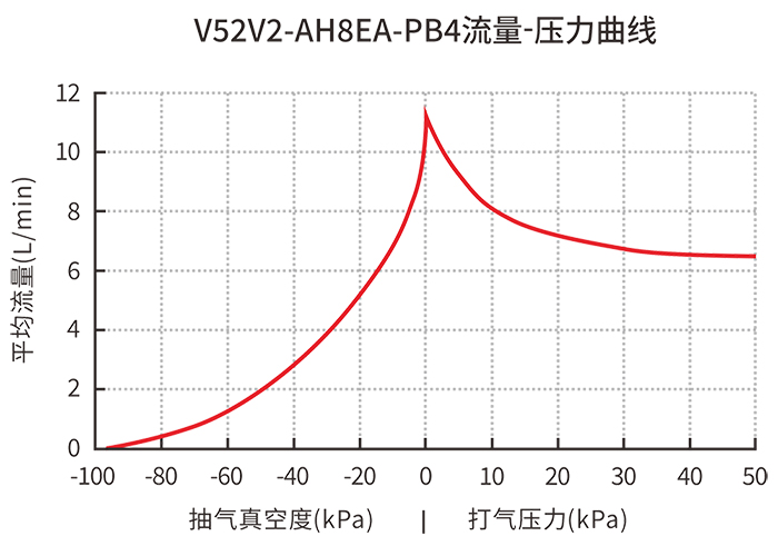 2)在保证MAX负压的同时,峰值流量也达到了15L/min(平均流量10L/min)!同时还有峰值流量22L/min,负压达到-88kPa的中大流量产品V52M2;以及峰值流量35L/min的大流量产品V52L2面市。