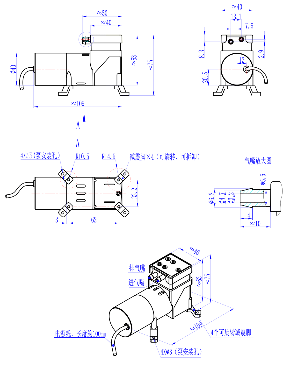 1)泵体积(默认气嘴朝向):(长×宽×高,包容尺寸,单位mm):约109×40×63(不含电机引出线、减震脚);