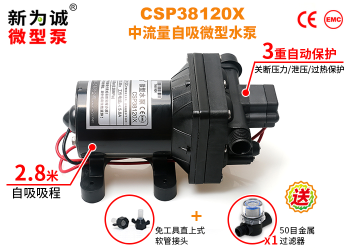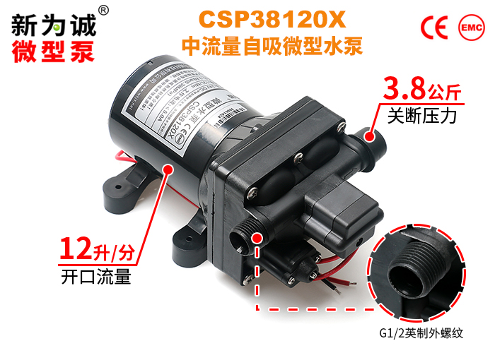 新为诚微型压力自吸水泵CSP-X,系热销产品CSP系列的压力、功能升级版,具备常见场景的典型流量及压力,如:开口流量(10-12升/分钟)及压力3.8公斤(一般自来水官网的流量大约10LPM,压力都在2-3公斤);