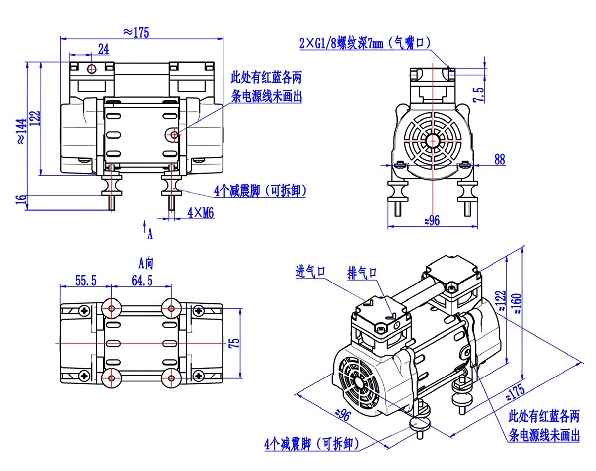 5、FYF08585-06G2AC交流活塞气泵外形尺寸图(以下图示单位:mm)