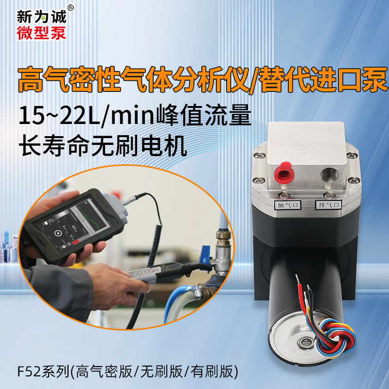 3)新增专业客户期盼的高气密性型号:针对高气密性低泄漏率的运用领域,新为诚研发推出:全金属高气密性泵头的F52T1,采用“不锈钢”金属泵头,气密性对比非高气密性的版本,提升近10倍!价格不足国外同类产品的十分之一!