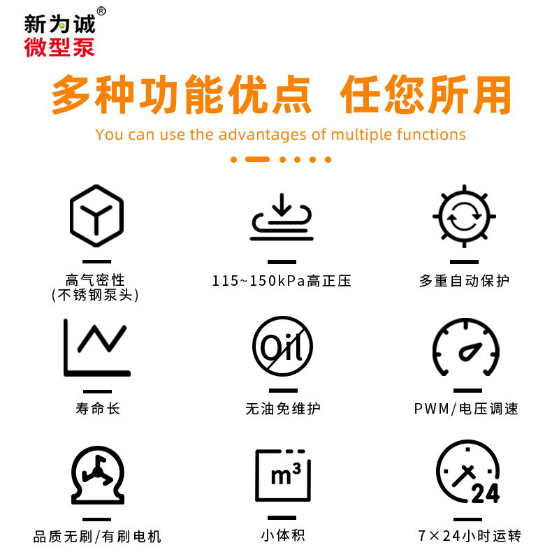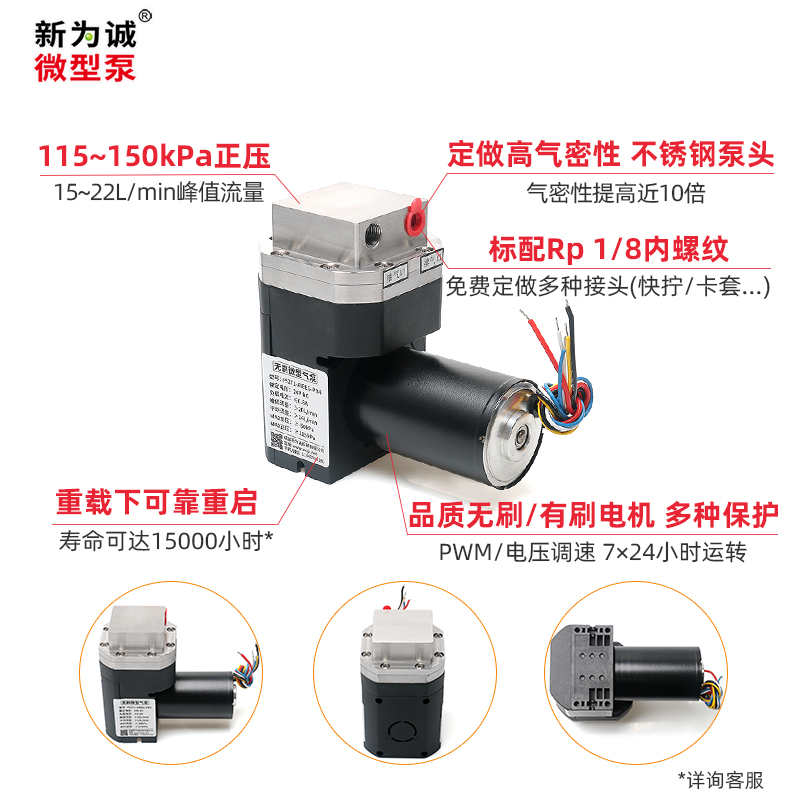1)新为诚F52,系原热销无刷微型气泵F50系列升级版;但正压还更高:目前单泵头可达150kPa(同样可7x24小时连续运转),未来双头产品还有正压更高产品,敬请期待...