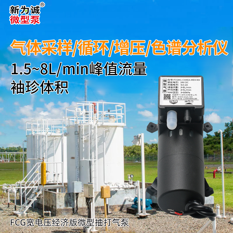 1.抽打两用微型气泵FCG,系新为诚推出的经济型微型抽打气泵,主打看重成本场合,例如气体采样、色谱分析仪用途,场景中克服阻力输送气体,或分析仪中需要有一定正压和流量才能正常检测;但负载不宜过大(也即抽气口、排气口承受的负压或正压,不能超过泵的MAX值;且不保证带载下可靠启动)!