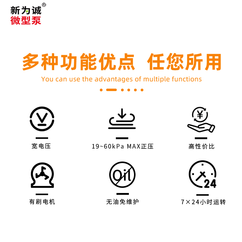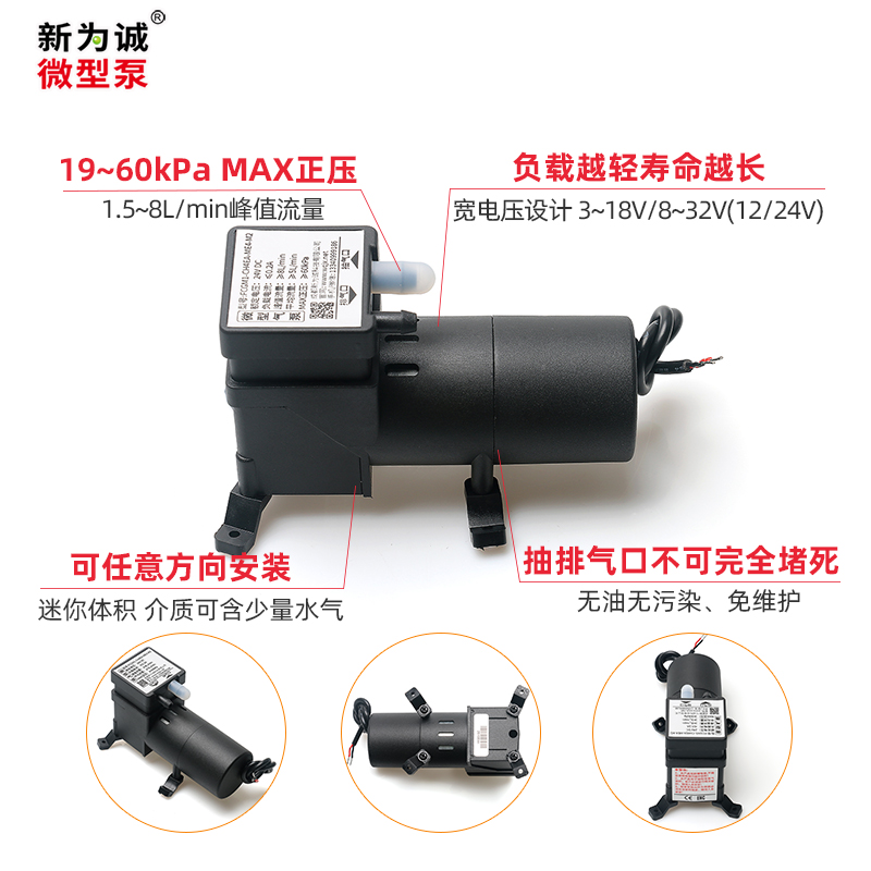 3.新为诚24v气泵FCG,特有的宽电压设计,12V型号可在3-18V范围内正常工作;24V可在8-32V范围内正常工作,适合额定电压28V/32V的特殊工况需求...