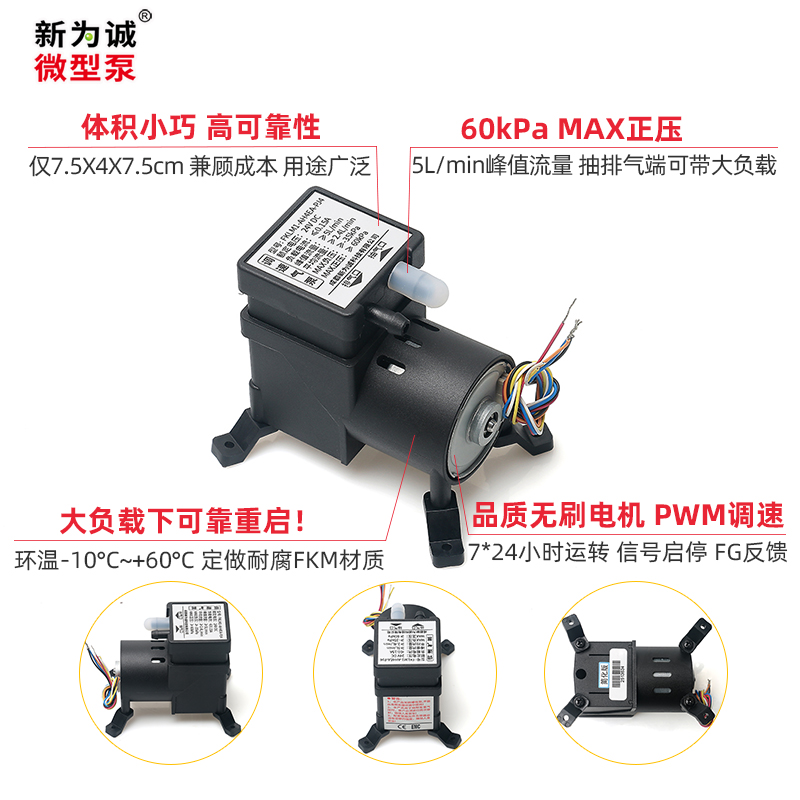 4、新为诚无刷微型气泵FKL,采用经过严格挑选、长期苛刻测试、定做的国产高品质无刷电机,简化版具有过载保护;